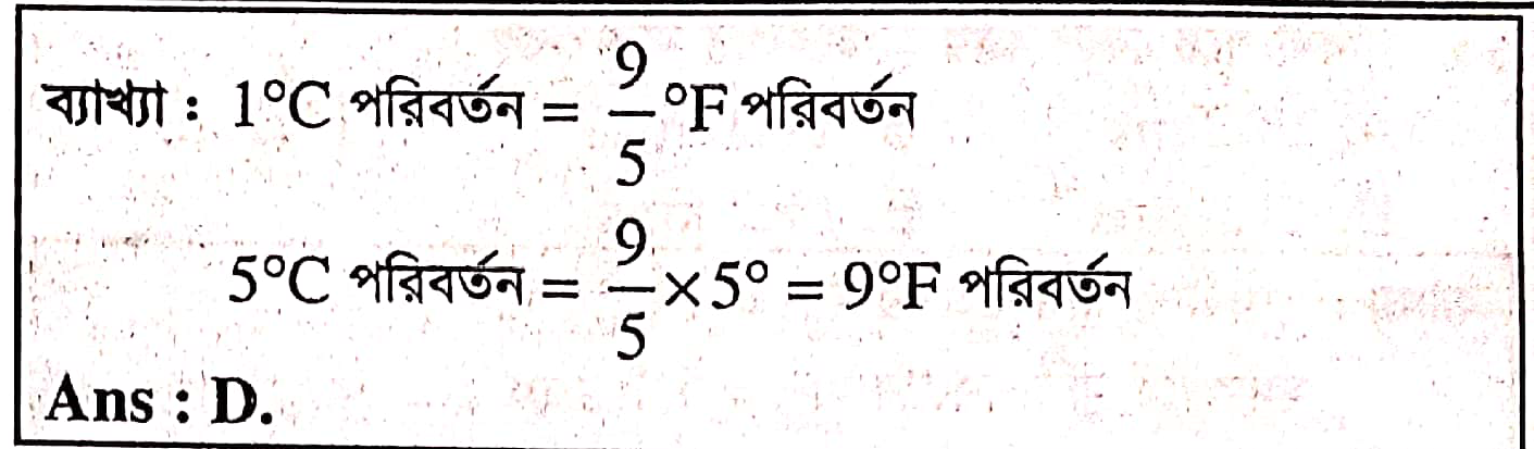 26. তাপমাত্রা সেলসিয়াস স্কেলে 5° পরিবর্তন হলে ফারেনহাইট স্কেলে পরিবর্তন হবে………।
