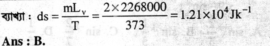 27. 100°C তাপমাত্রায় 2kg পানিকে 100°C তাপমাত্রার বাষ্পে পরিণত করলে এনট্রোপের পরিবর্তন কত? (পানির বাস্পিভবনের আপেক্ষিক সুপ্ততাপ = 2.26 × 106 J kg-1)