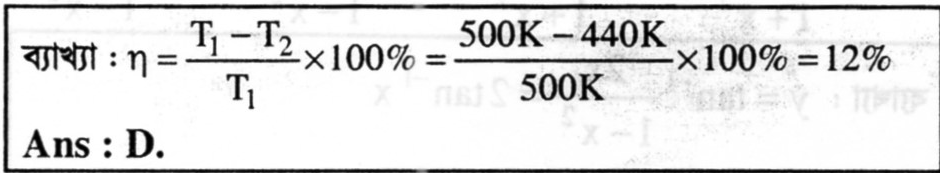 35. একটি কার্নো ইঞ্জিন 227° C তাপমাত্রার তাপ গ্রহণ করে ও 167° C তাপমাত্রায় তাপ বর্জন করে। ইঞ্জিনটির দক্ষতা কত?