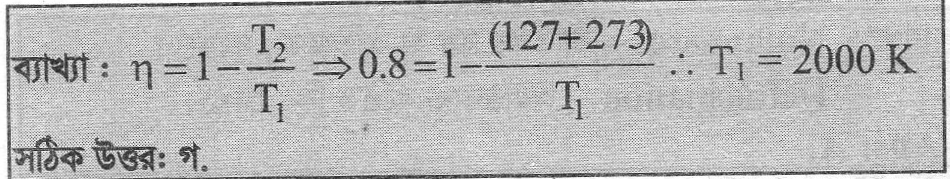 38. একটি তাপ ইঞ্জিনের কর্মদক্ষতা 80%। গ্রাহকের তাপমাত্রা 127°C হলে উৎসের তাপমাত্রা কত?