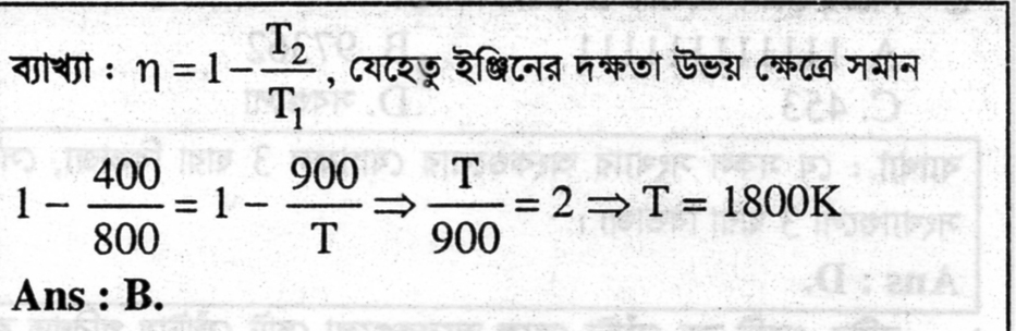 36. একটি কার্নো ইঞ্জিন 800oK ও 400oK তাপমাত্রায় যে দক্ষতায় কাজ করে, ঠিক সমদক্ষতায় কাজ করে ToK এবং 900oK তাপমাত্রায় । তাপমাত্রা T কত?