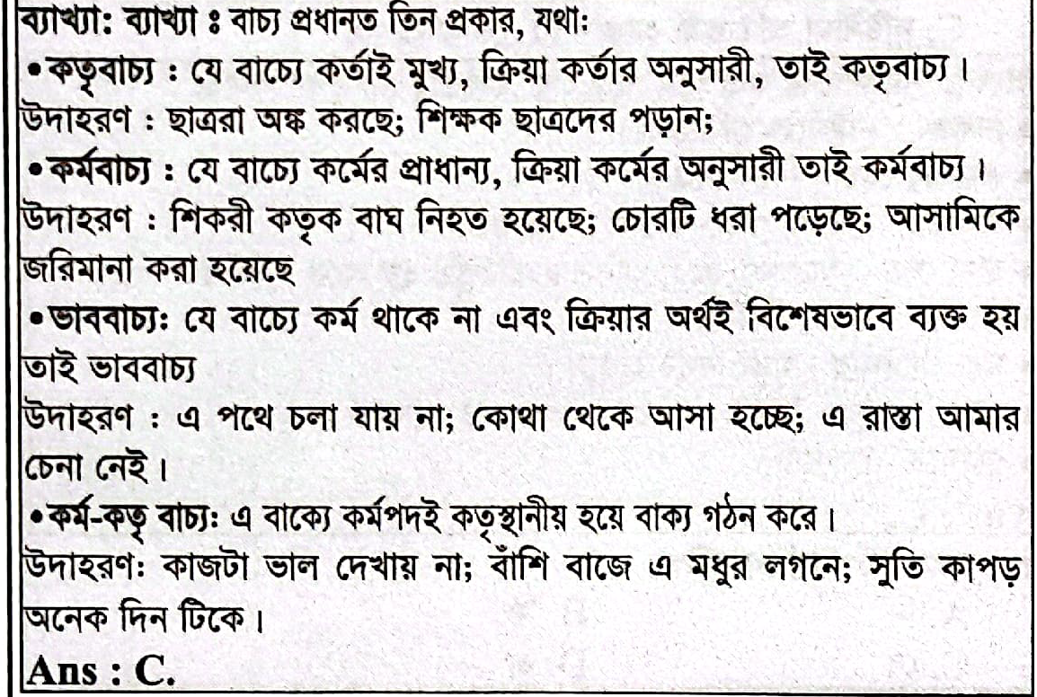 99. বাশি বাজছে।’- কোন বাচ্যের উদাহরণ ?